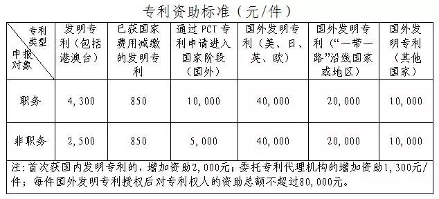 (一)国内(包括港澳台)发明专利授权后对专利权人的资助:对职务发明专利,资助4,300元/件;对非职务发明专利,资助2,500元/件;获国家知识产权局费用减缴的发明专利,资助850元/件。对首次获发明专利的,增加资助2,000元;对委托专利代理机构的,增加资助1,300元/件。