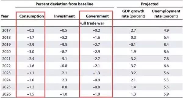 通过彼得森研究所这个表格可以看到,在全面贸易战情况下,美国的消费水平(上图中consumption一列)将大幅下滑,政府支出(上图中government一列)同样如此。