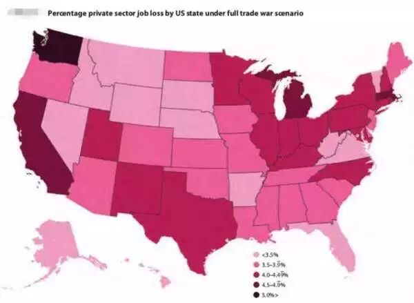 ▲全面贸易战情况下,美国各州私营部门损失的就业比率