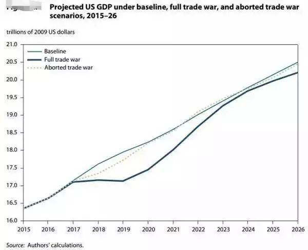 从上图可以看到,在全面贸易战情况下,2017年~2019年,美国GDP将完全停滞,彼得森研究所将其称之为“衰退”(recession)。即便之后美国GDP重回增长轨道,在以后的所有年份,美国的GDP水平都赶不上没有贸易战的正常情况(虚线)。