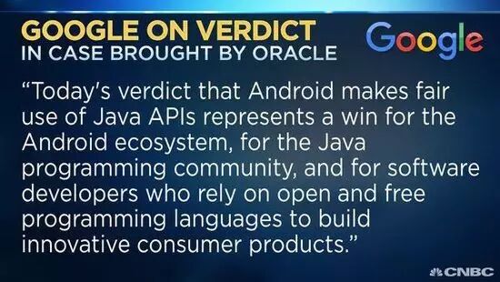 谷歌通过电子邮件发表声明称:“无论是对于安卓生态系统、Java编程社区还是依靠开放免费编程语言开发创新消费产品的软件开发者来说,今天的裁决都代表着巨大胜利。”