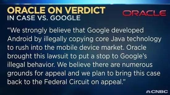 然而甲骨文首席律师多里安·达利(Dorian Daley)表示:“我们坚信谷歌在开发安卓系统过程中非法复制了Java的核心技术,借此进入移动设备市场。甲骨文提起诉讼的目的是阻止谷歌的非法行为。我们认为有无数理由支持上诉。”但有阿法律专家认为,推翻这一裁决将会很难。